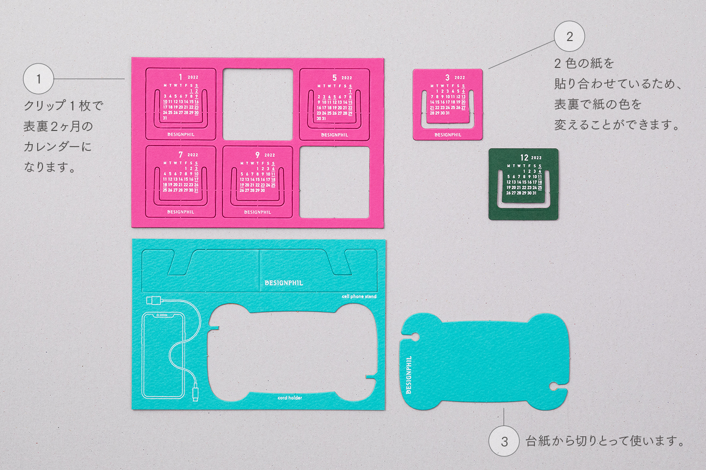 スマホスタンドやクリップ仕立てのカレンダーなど、もらったら嬉しいアクセサリーが型抜きされたカードです。薄くて軽いので持ち運びに便利。ノベルティとして安価に郵送することもできます。