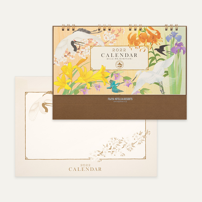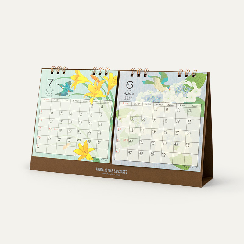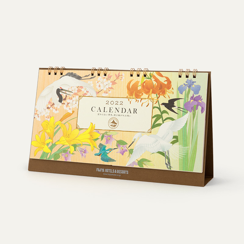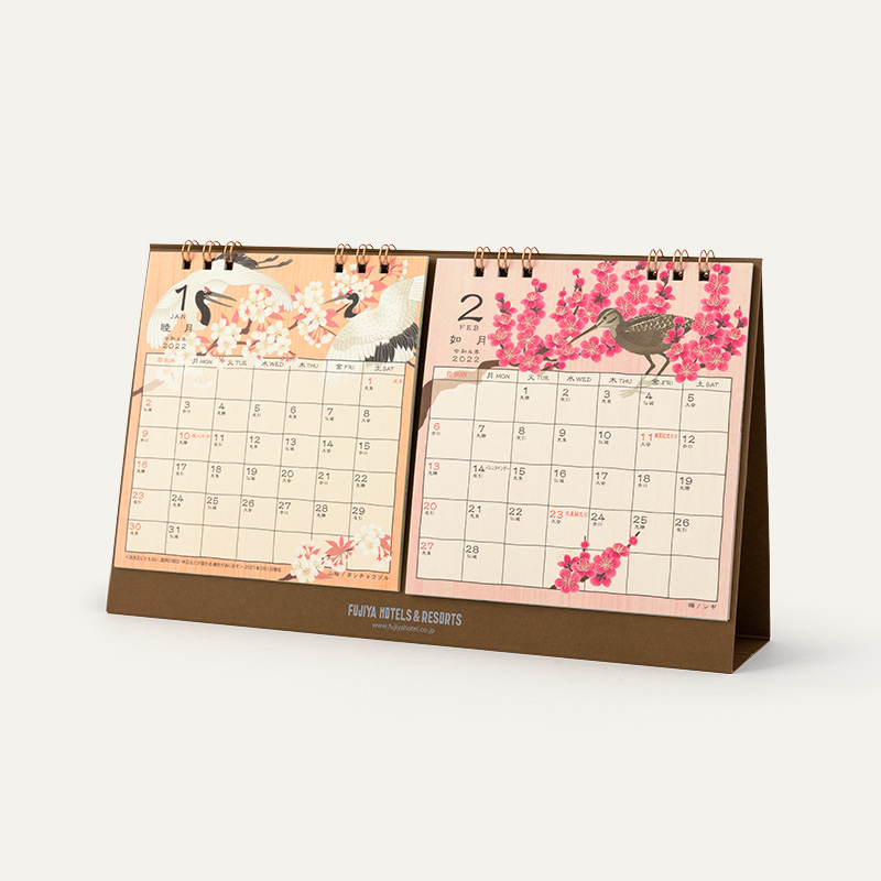 シングルタイプのカレンダーと比較して幅が広く、華やかな表紙が卓上を彩ります。