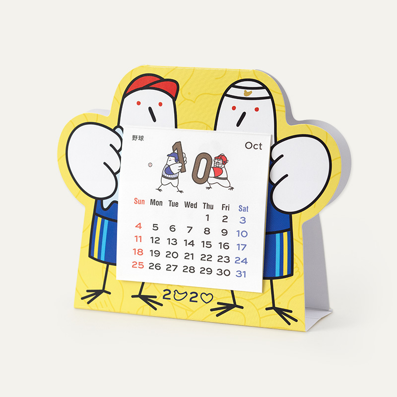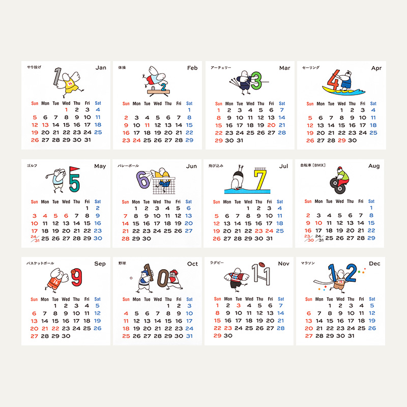 2020年はスポーツをテーマに、各月の数字に遊び心溢れる鳩人イラストを添えました。